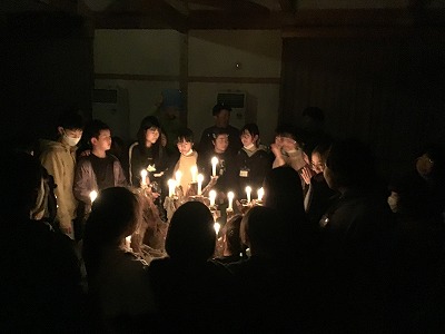 キャンプファイアの予定でしたが、夕方から雪が降ってしまい、キャンドルファイアに変更しました。