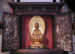 内部の天井に、康応(こうおう)2年(1390)の墨書銘があることにより、室町時代初期制作の貴重な文化財で あることが知れます。特に台座の格座間(ごうざま)の操(刳り)形には、当時の簡素で力強さを備えた特徴がよく現れています。