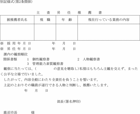 第2条 規則別表第2第1項に掲げる職へ昇任させる場合の選考は、部長及び会計課長からの主査昇任推薦書(