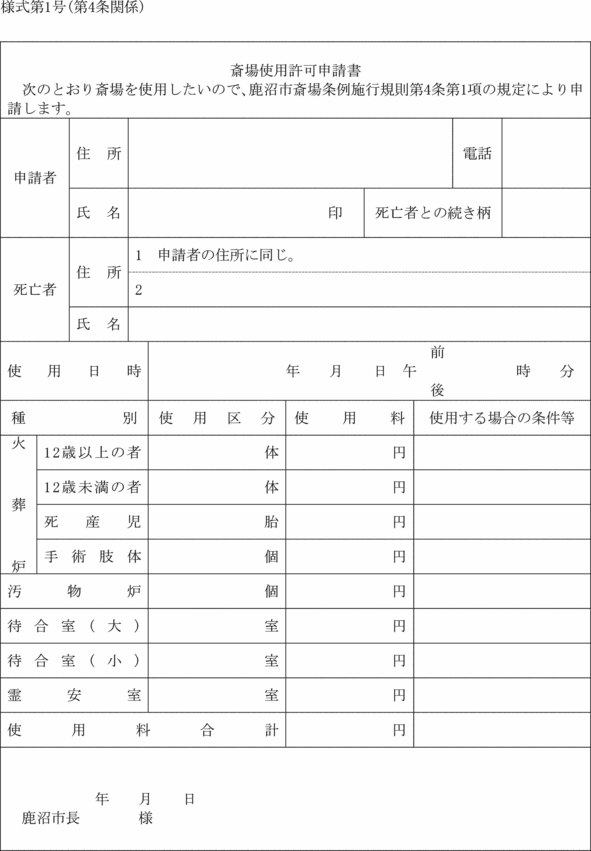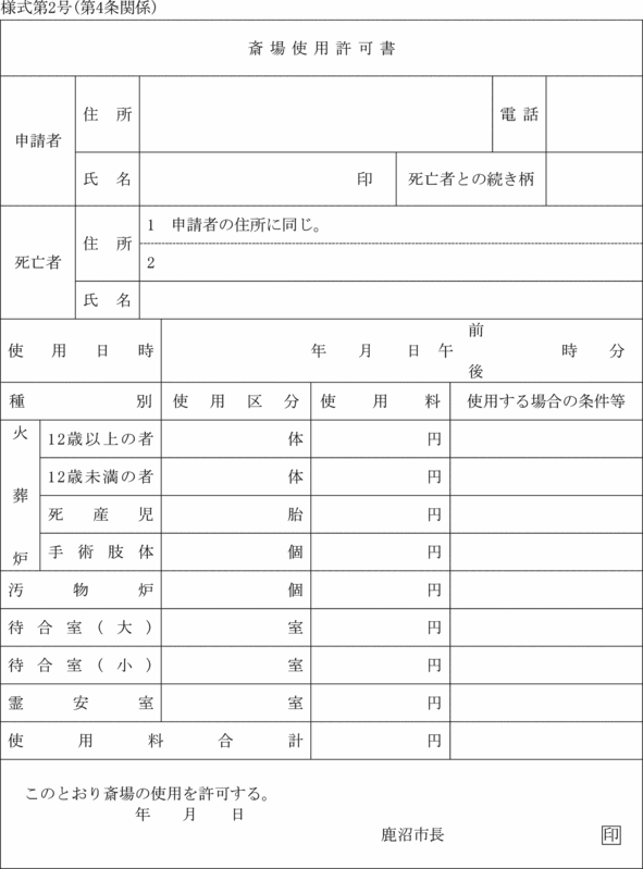第4条 条例第3条第1項の規定により許可を受けようとする者は、斎場使用許可申請書(