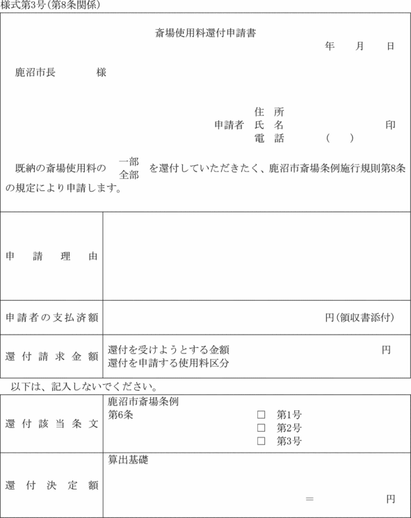 第8条 条例第6条ただし書の規定により使用料の還付を受けようとする者は、斎場使用料還付申請書(