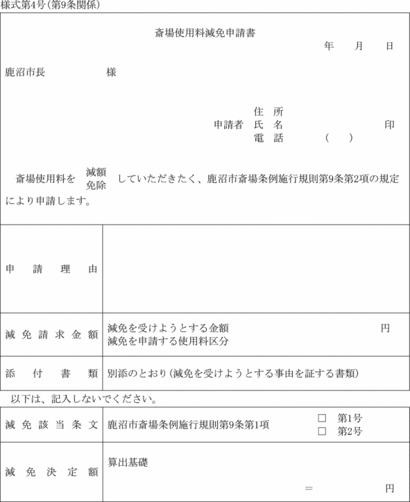 2 前項の規定により使用料の減免を受けようとする者は、斎場使用料減免申請書(